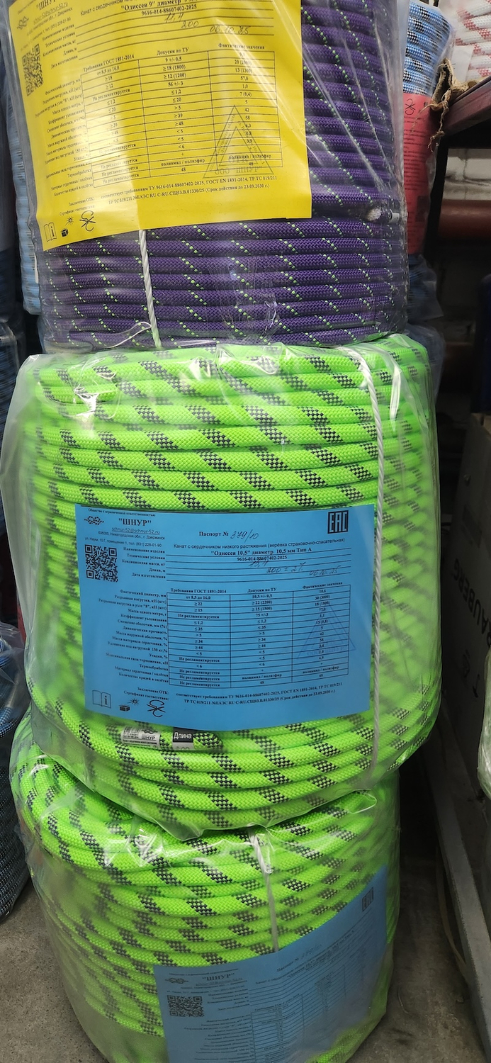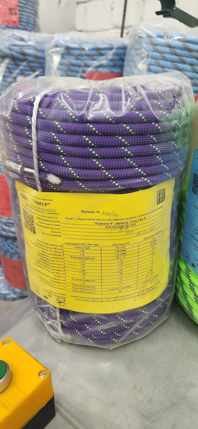 Верёвка страховочно-спасательная статическая 9 мм “Одиссея 9” 48 прядная с полиамидным сердечником низкого растяжения, оплётка из кручёных полиэфирных нитей, термообработанная.