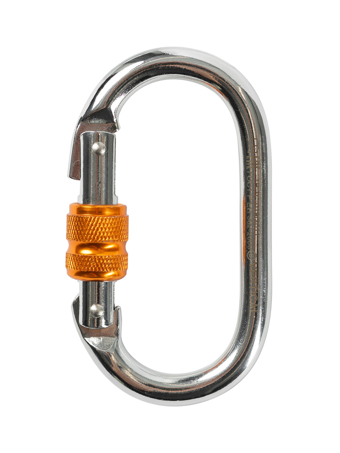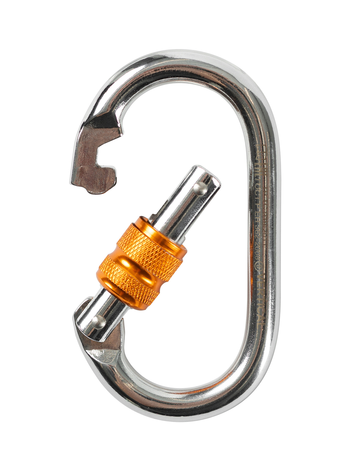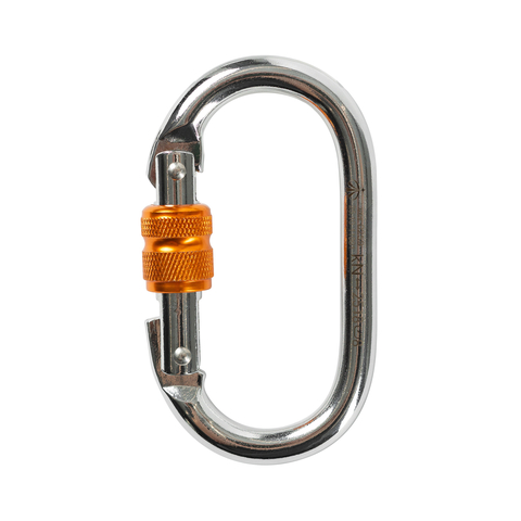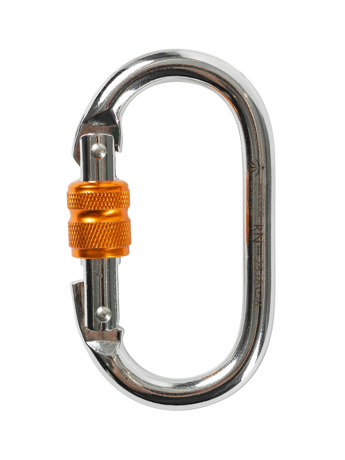 Стальной карабин овальной формы. Может применяться для организации самостраховки, станций, присоединения страховочных устройств и т.д. Симметричная форма карабина исключает отклонение от основной оси при нагрузке, что особенно важно при работе с блок-роликами и устройствами с двумя симметричнымии щечками. Винтовая муфта максимально снижает риск самопроизвольного раскрытия карабина. Может использоваться в скалолазании, альпинизме, спелеологии и промышленном альпинизме.